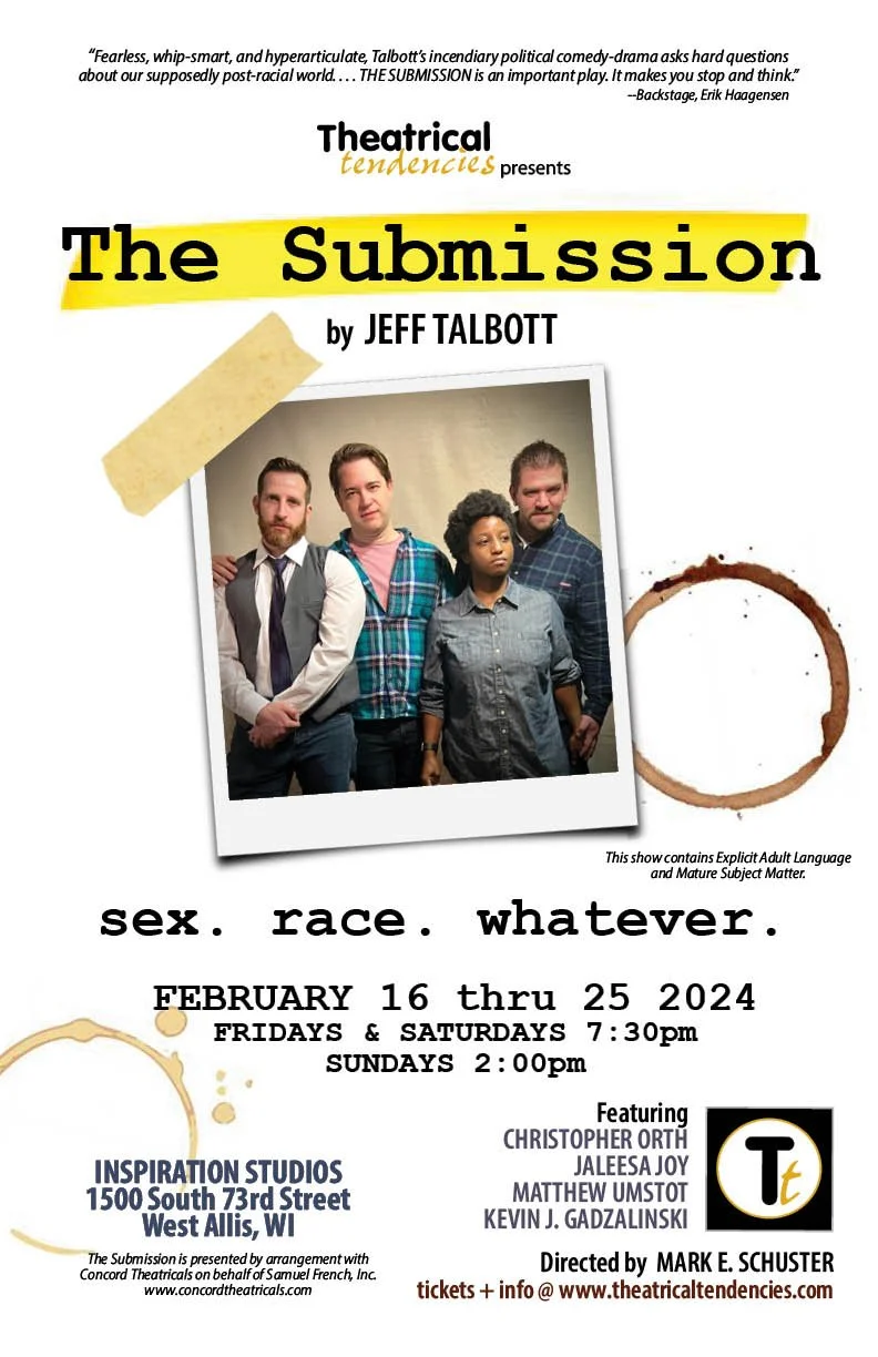 This is the story of Shaleeha G'ntamobi's stirring new play about an alcoholic black mother and her card sharp son trying to get out of the projects. It has just been accepted into the nation's preeminent theater festival, but the trouble is, Shaleeha G'ntamobi doesn't exist, except in the imagination of wannabe-playwright Danny Larsen, who created her as a kind of affirmative-action nom-de-plume. But a nom-de-guerre may prove more useful as the lies pile up, shaky alliances are forged, and everyone dear to Danny must decide whether or not to run for cover as the whole thing threatens to blow up in his lily white face. The Submission is "a raw, unsentimental play about race and gender that exposes the quiet prejudice and intolerance among even our most progressive thinkers. It is both uncomfortable and impossible to not watch".
